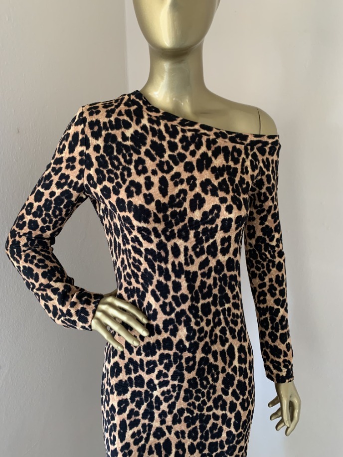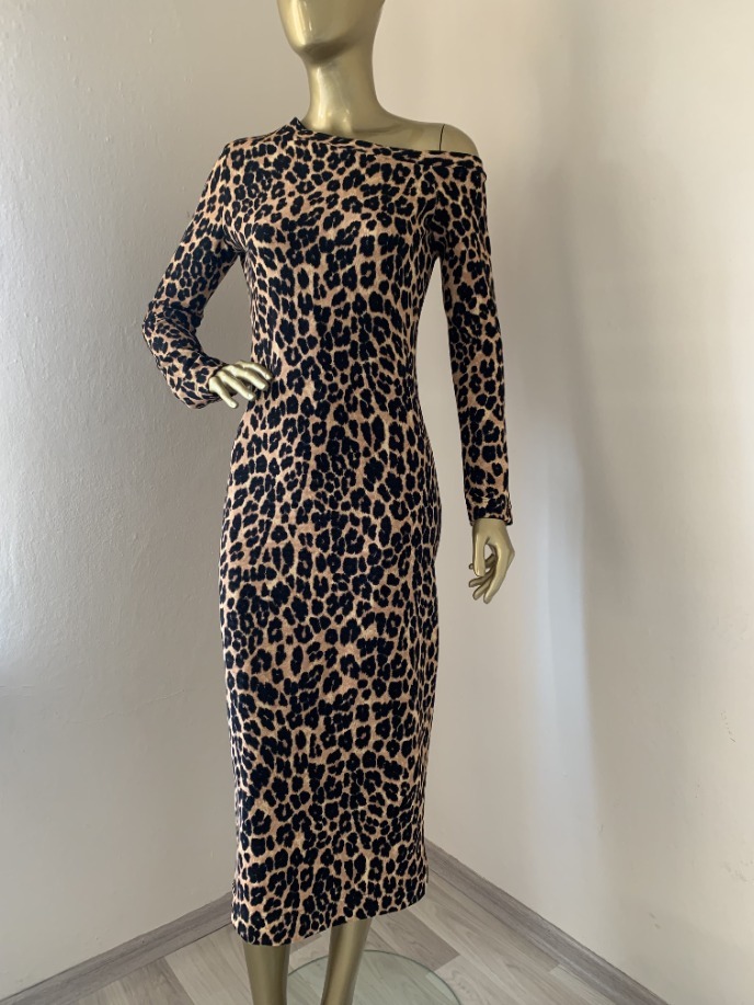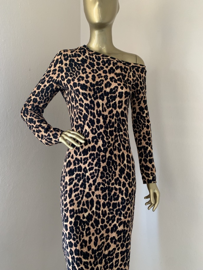Leopar Desenli Tek Omuz Açık Detay Tok Jarse Kumaştan Mıdı Boy Elbise, Hand made, Özel Dikim işi