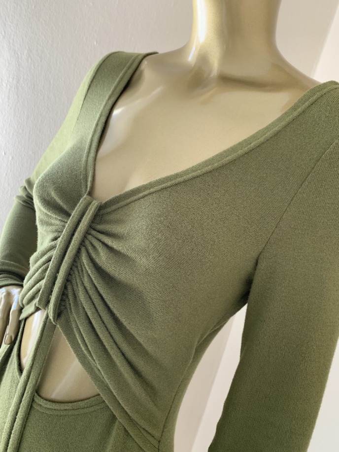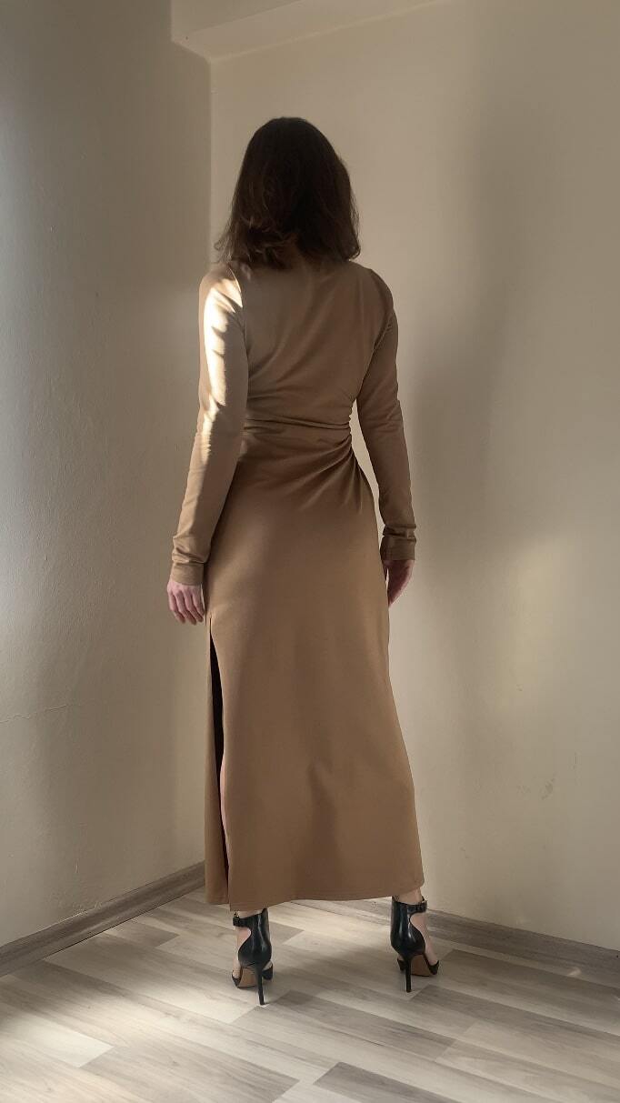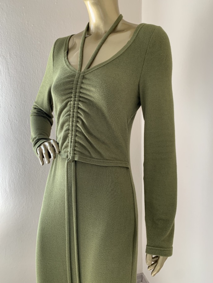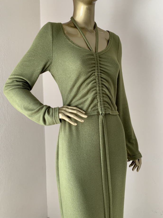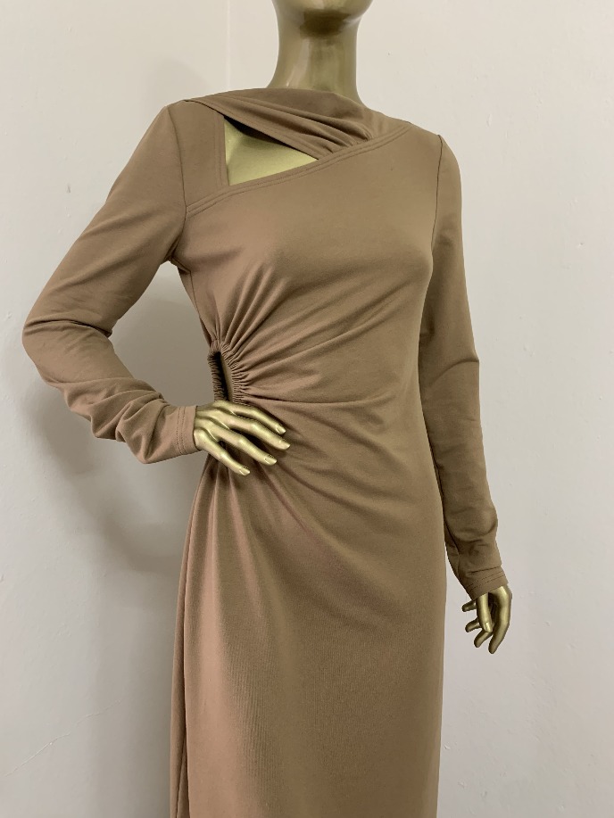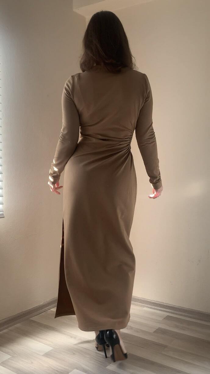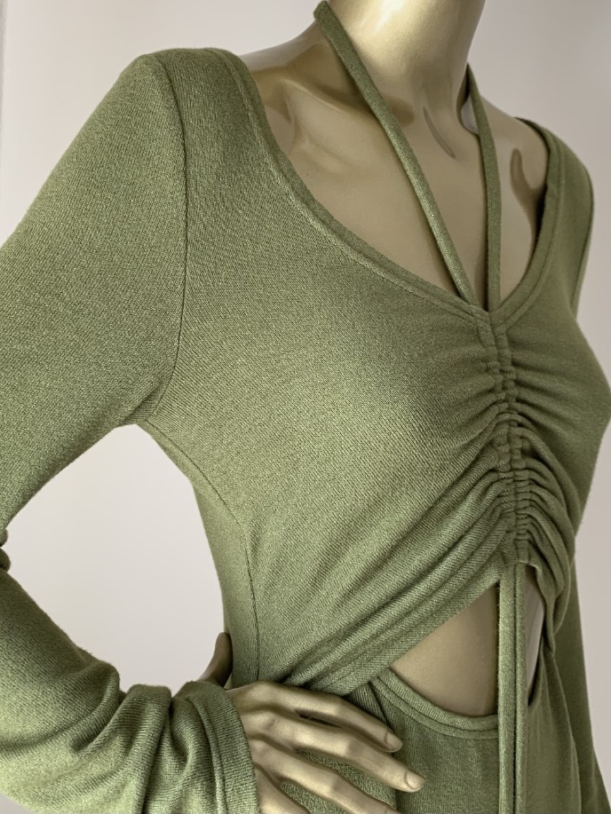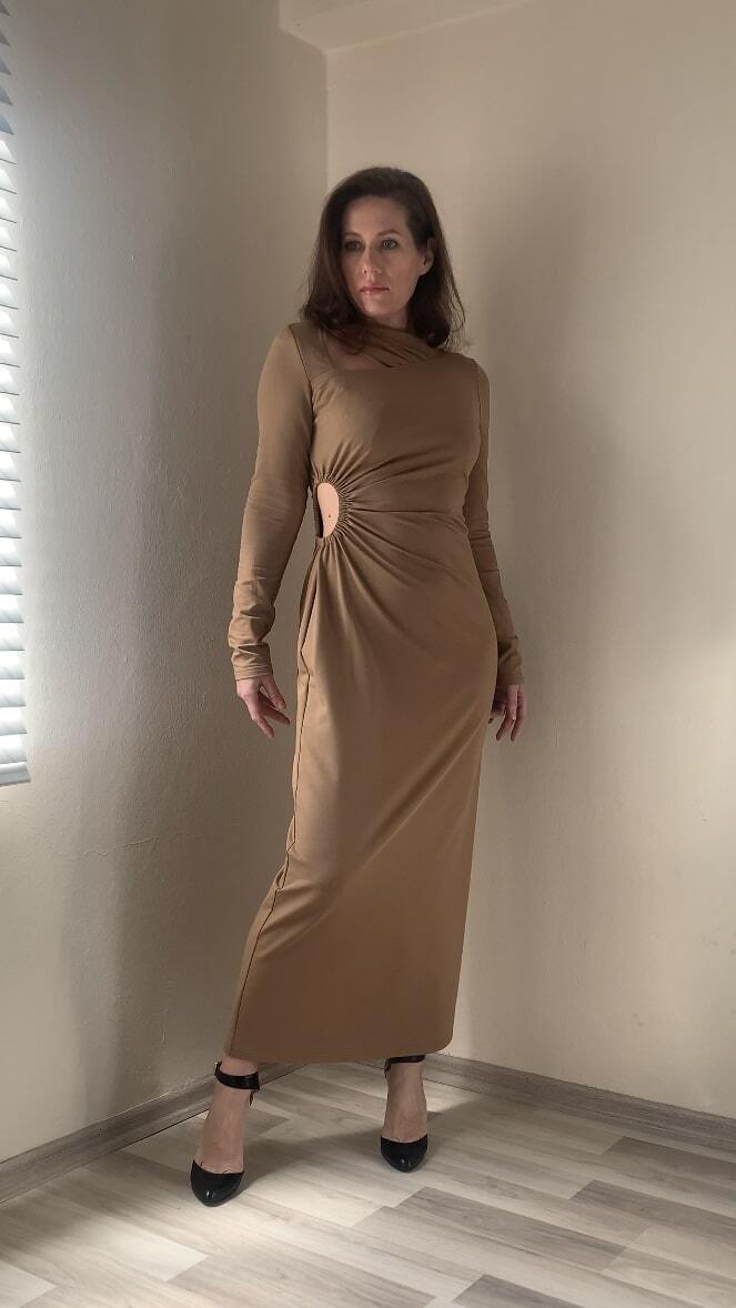 Dekolteli Büzgülü Bağcıklı Önden Cutoutlu Maksi uzunluktaki, vücuda oturan düşük hacimli bir elbise. Elbisenin önü üst ve alt olmak üzere iki parçadan oluşuyor. Göğüs kısmında büzgü ipi bulunmakladır, cutoutlu bölge açılıp kapatabilir. Kolları uzun ve hacimlidir. Yaka kısmı derin V şeklinde. Elbisenin boyu maksidir. Tasarım elbise, hand made.