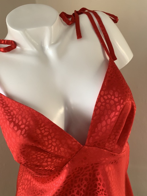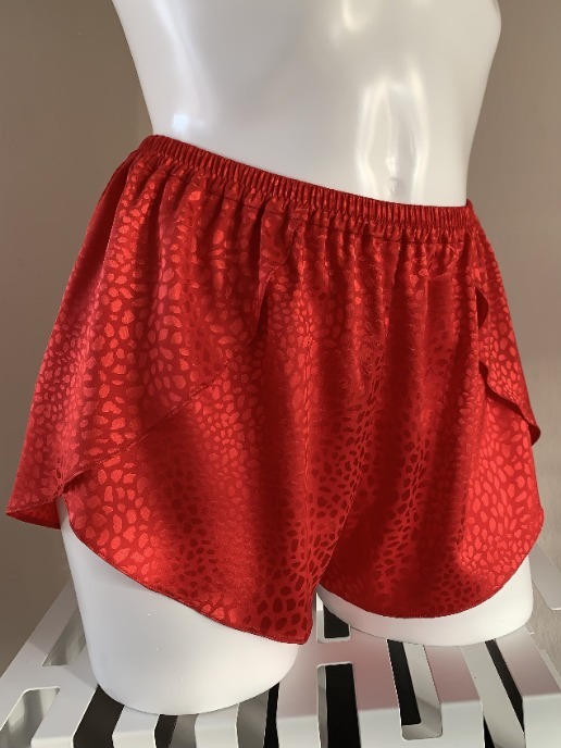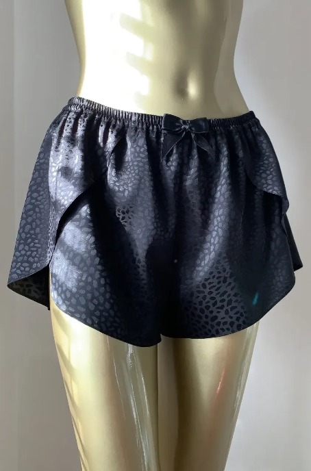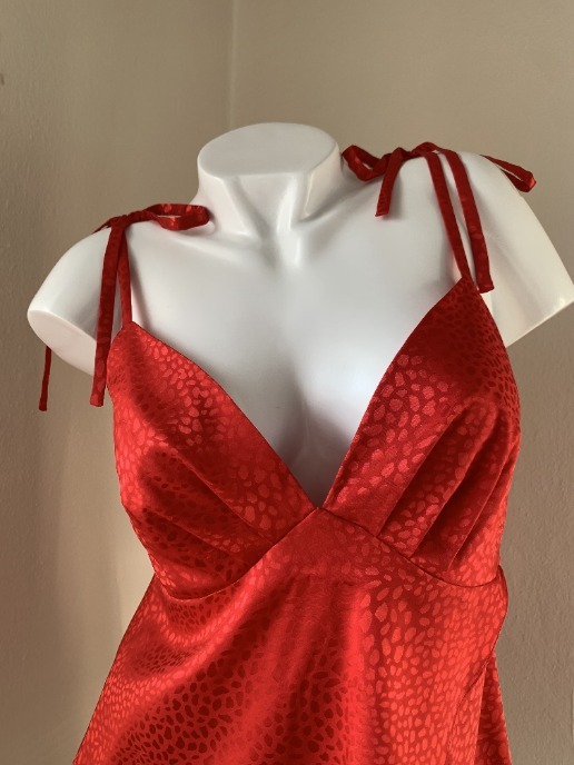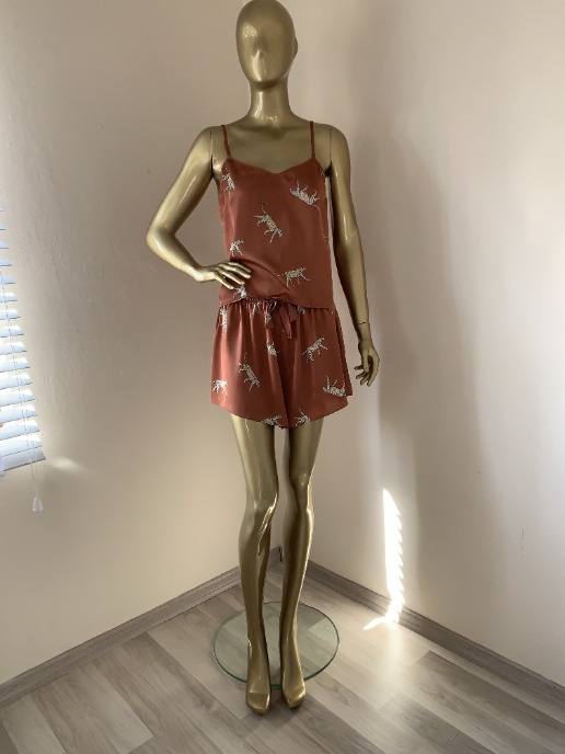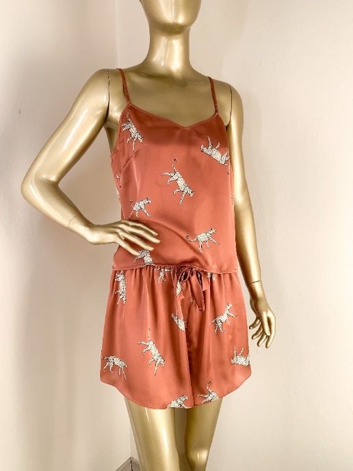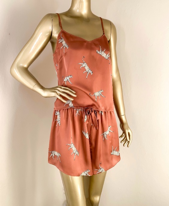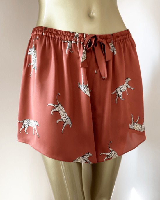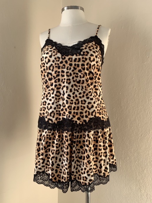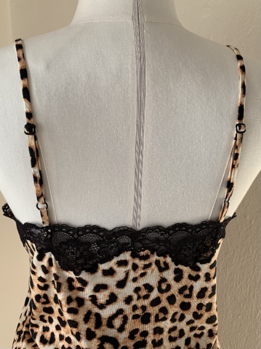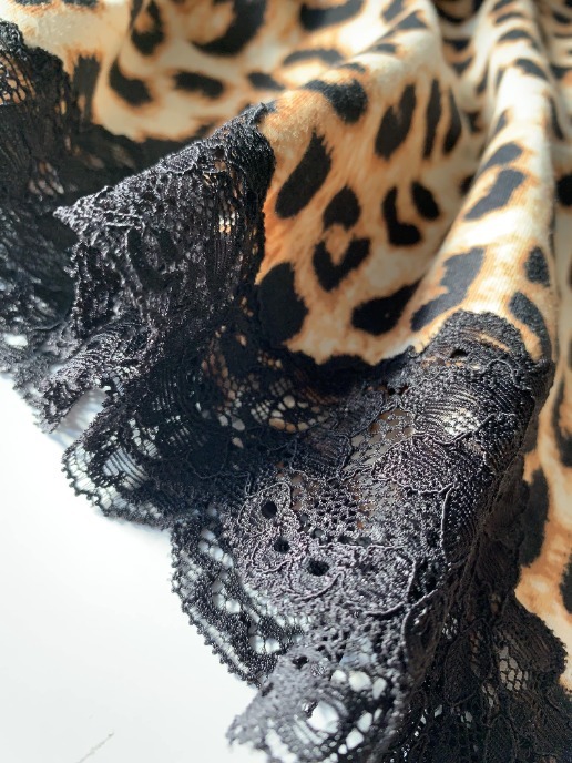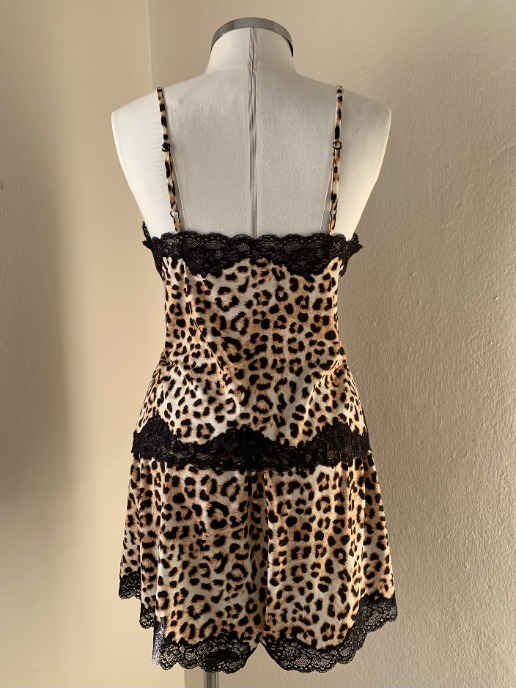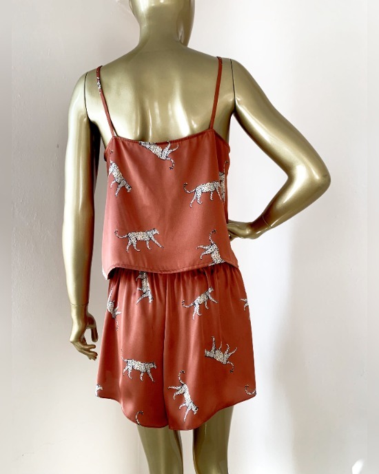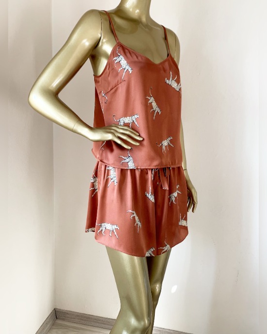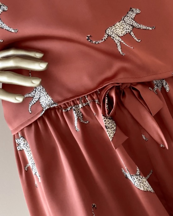 Leopar desenli, narin, yumuşak bakır rengi satenden yapılmıştır.