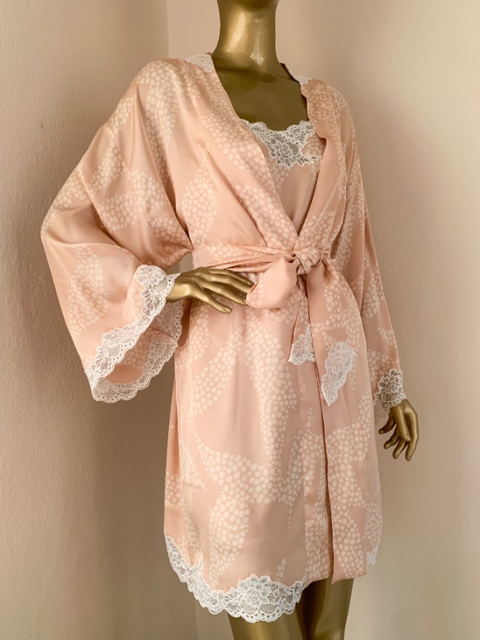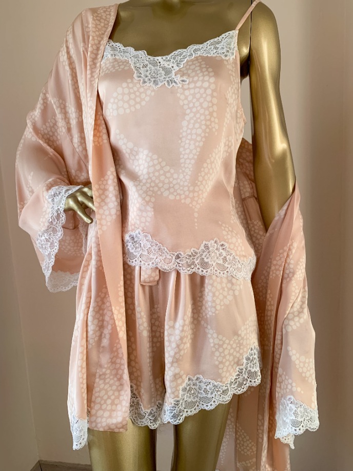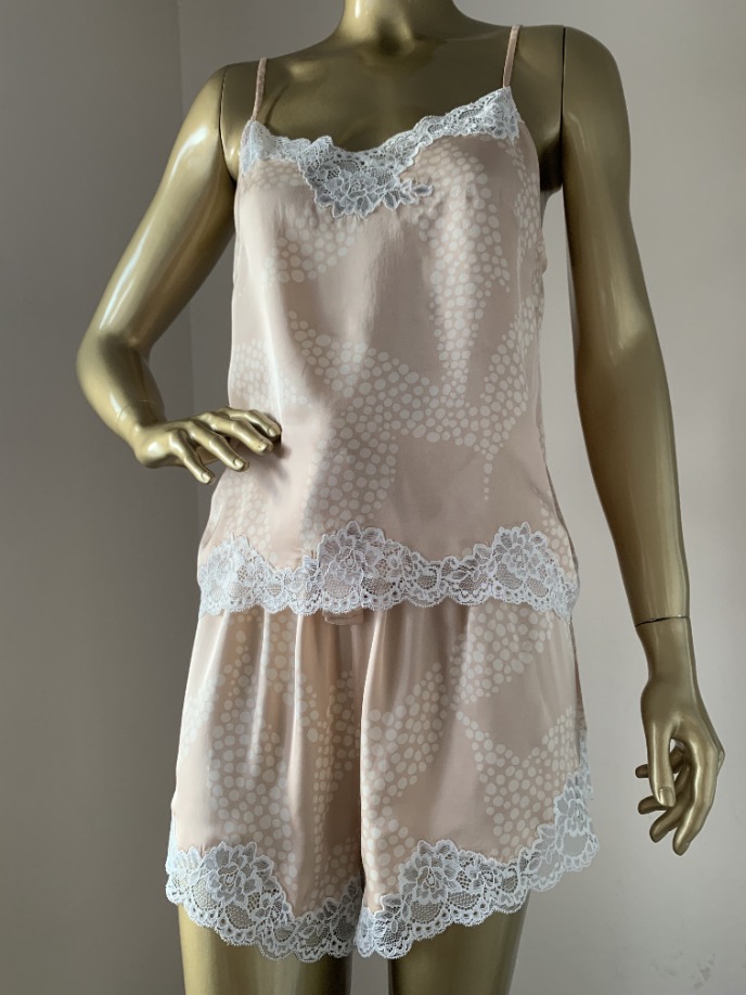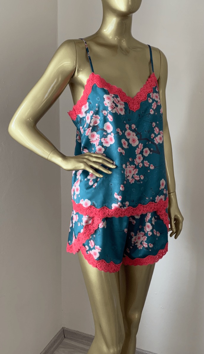Rahat ve şık bir pijama takımı. Dantel süslemesi kakma tekniğiyle yapılmıştır. Hand Made.