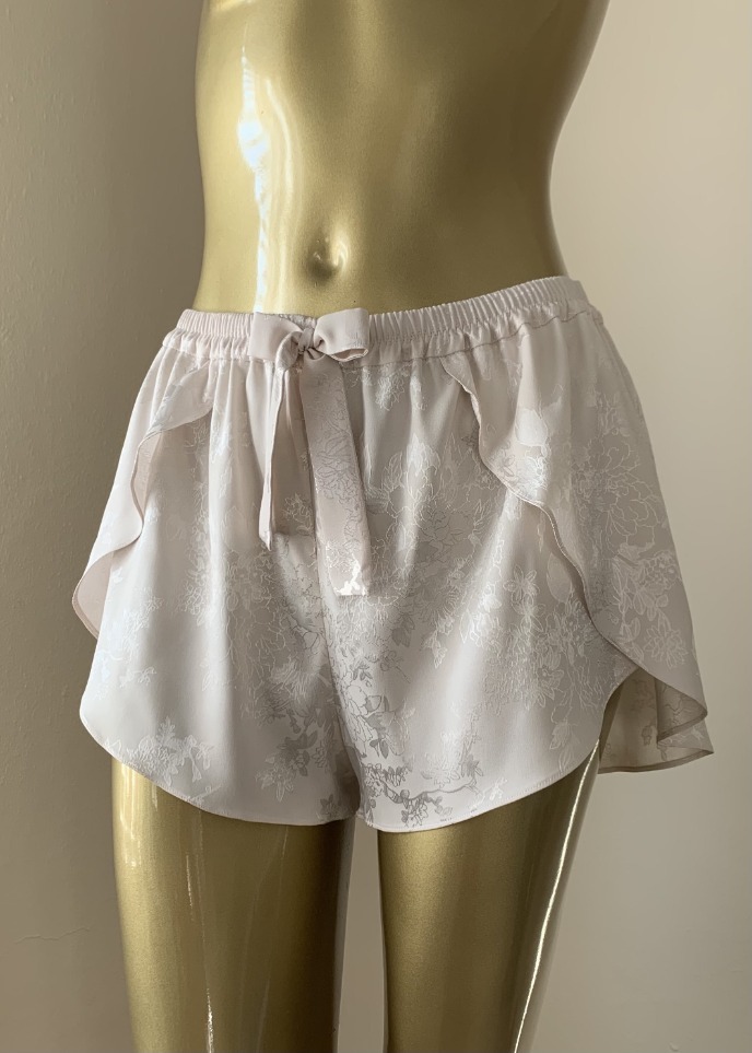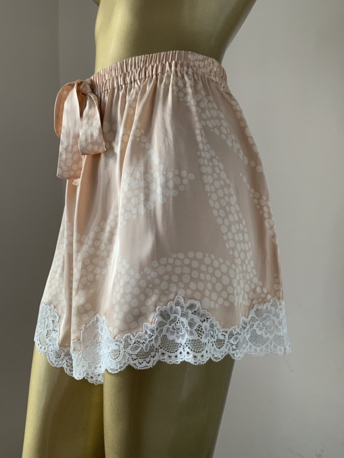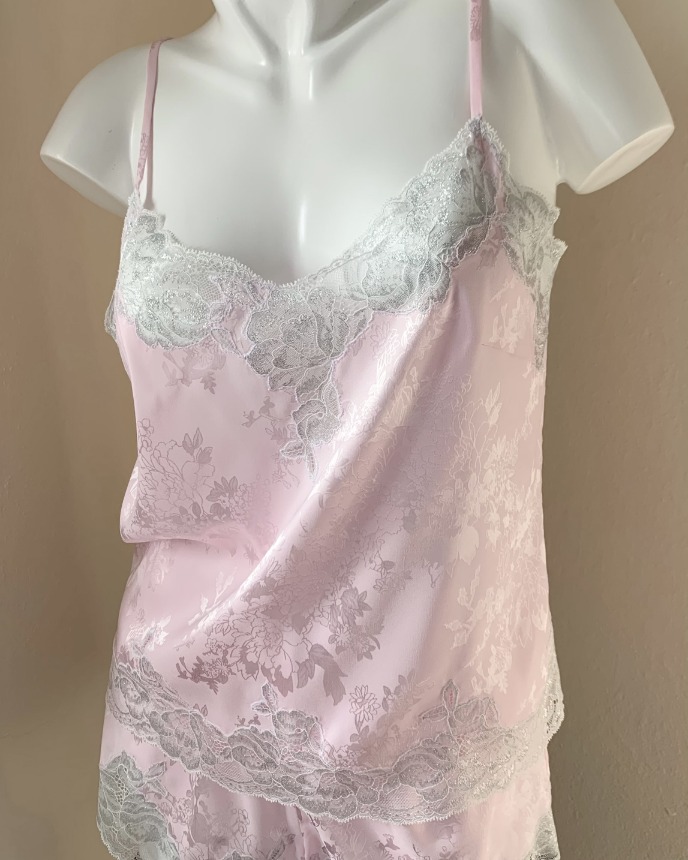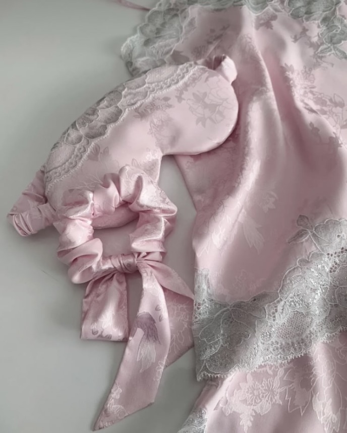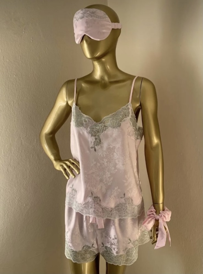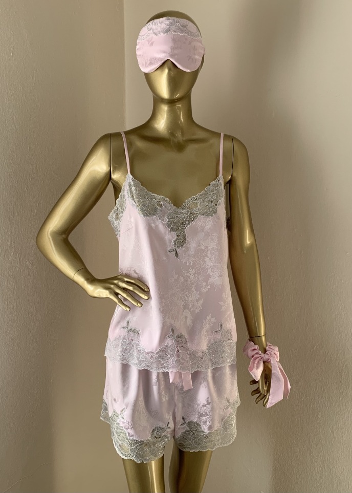 Gümüş Dantel İşlemeli Pembe Saten Üst ile Şort, Uyku Göz Maskesi, Fiyonklu Scrunchie Saç Tokası - 4'lü takımı.